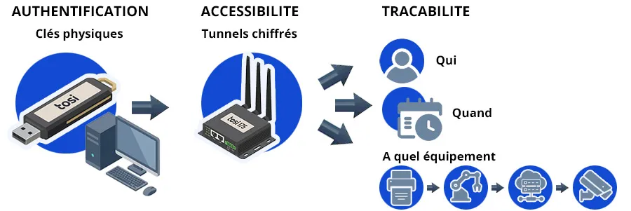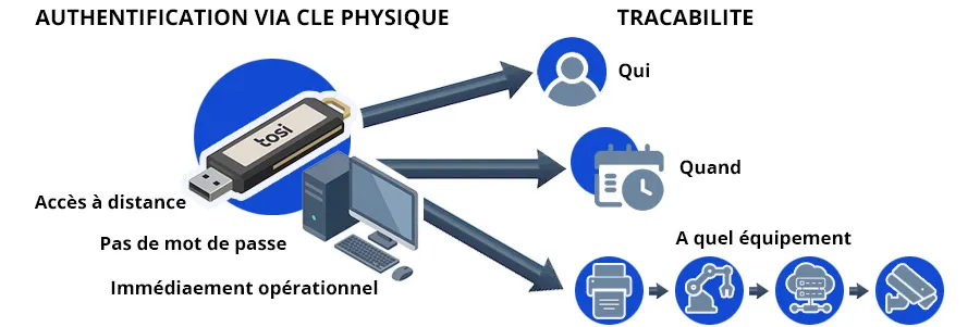 Authentication relies on a physical key, not a password. Each login is tracked: who accesses, when, and to what. Compliant with the highest OT/IT requirements.