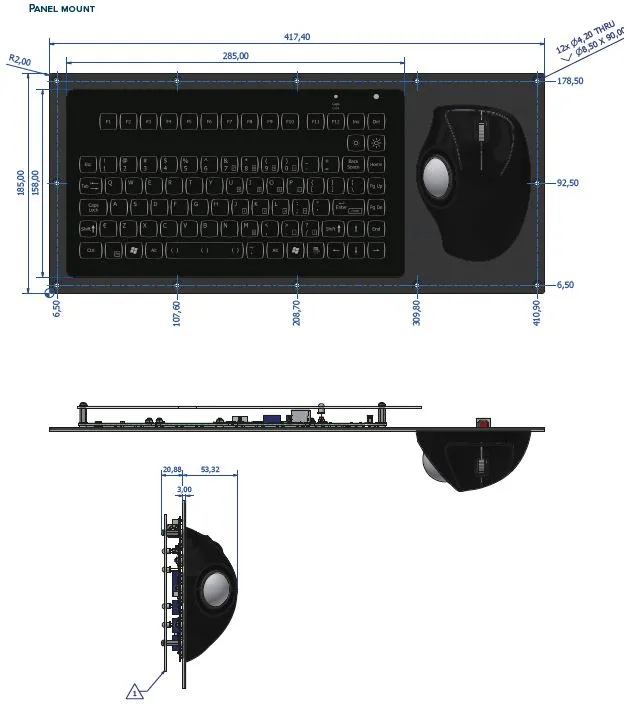 Clavier industriel IP65 compact encastrable rétroéclairé avec trackball ergonomique – US QWERTY