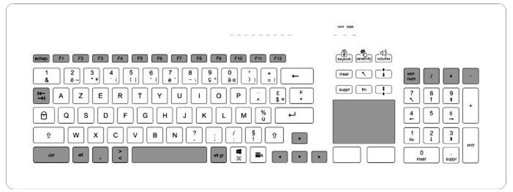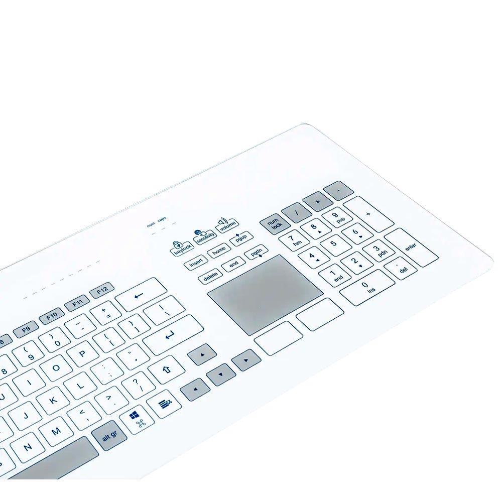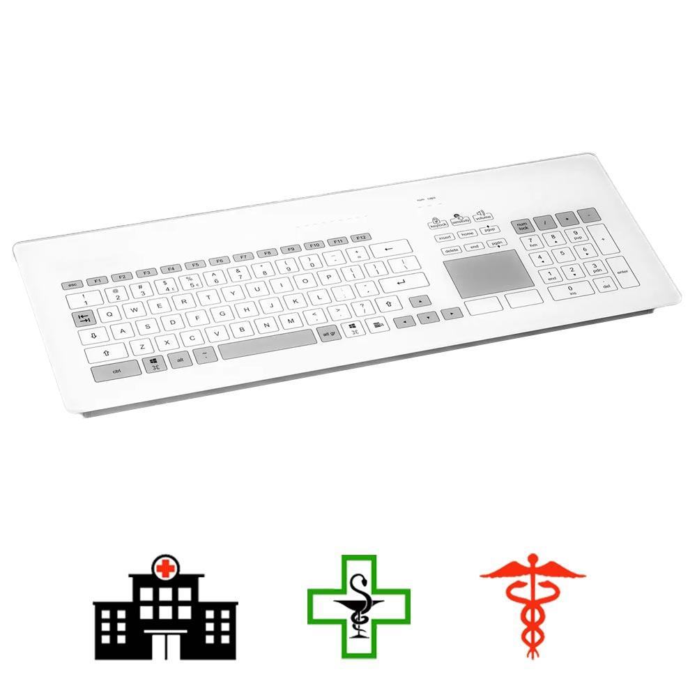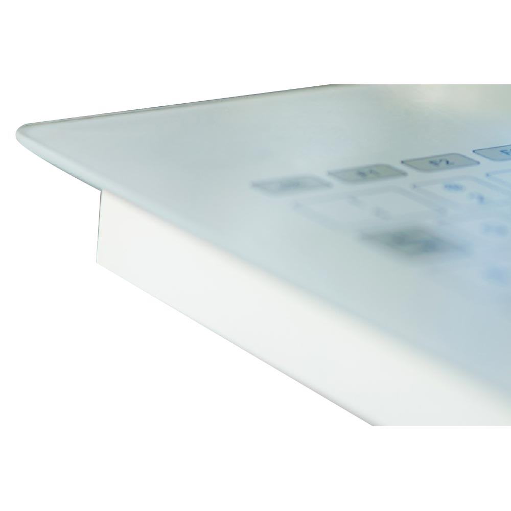 - Excellente hygiène : grâce à sa conception en verre lisse, le clavier est lavable et désinfectable, ce qui aide à prévenir l'accumulation de germes pathogènes