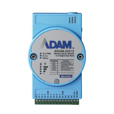 ADAM-2051Z-AE Module ADAM ZigBee, 8 channels Digital Input Node Standard IEEE 802.15.4 sans fil Basse énergie Alimentation par 2 piles AA alcalines Portée juqu'à 110 m en extérieur Résistance d'entrée de 10Kohm