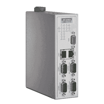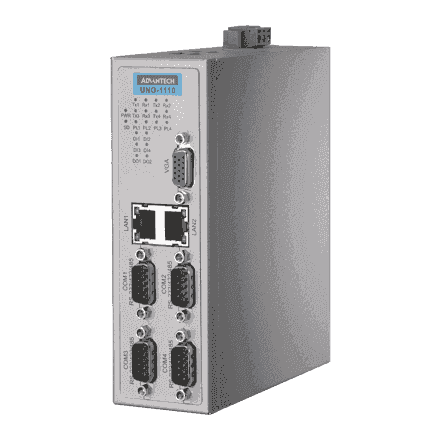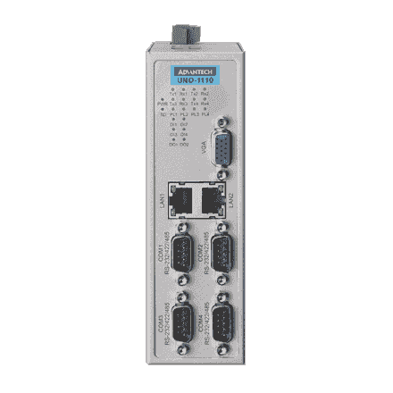UNO-1110-R11AE PC industriel fanless à processeur TI Cortex A8, 256MB DDR2, VGA, WinCE 6.0 4 x RS-232/422/485, 1 x RS-485 2 X 10/100 Mbps et 2 x slots SD card Windows® CE 6.0 Ready et en option support uClinux Option Rail-Din et montage mural Sans ventilation et s