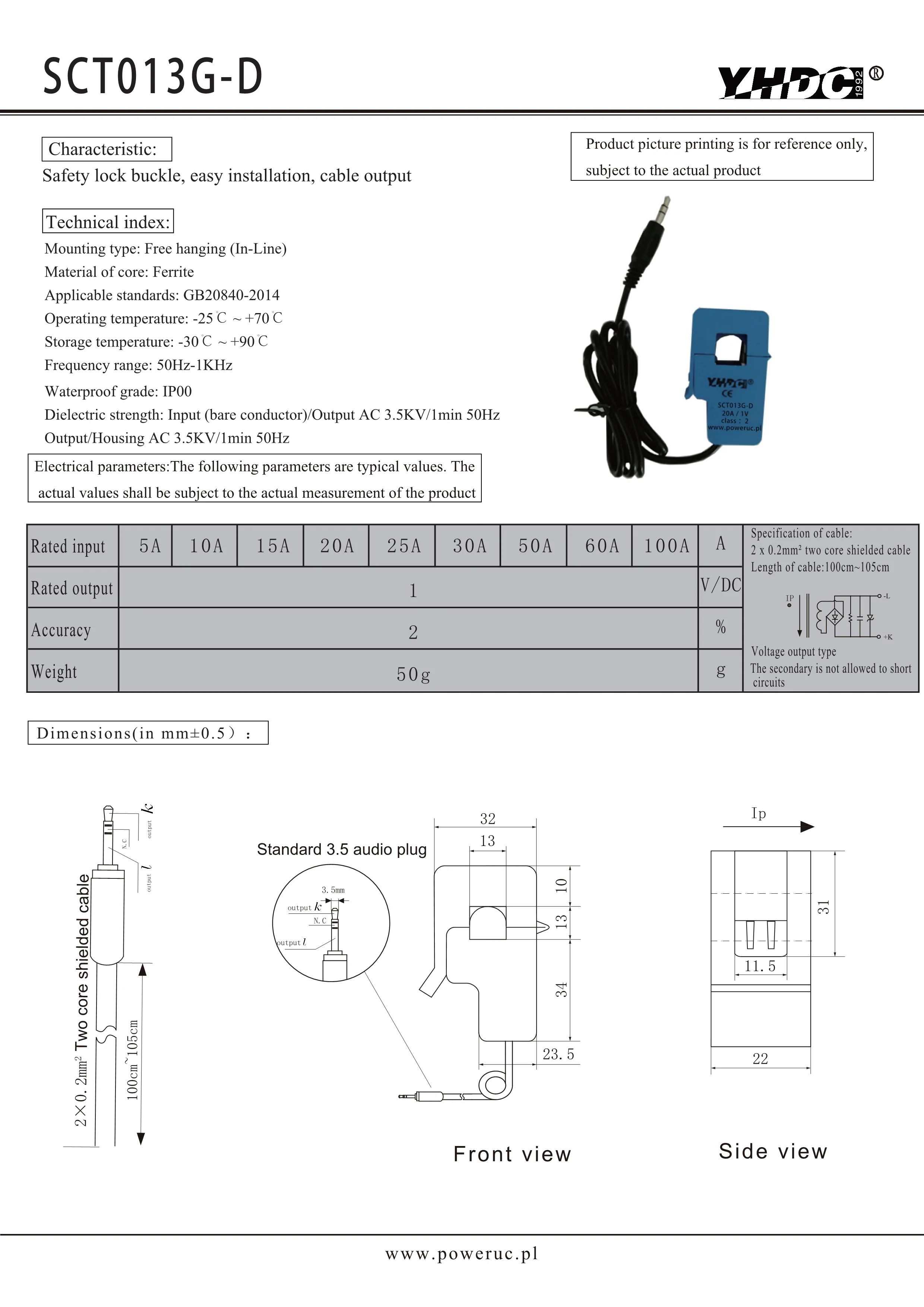 Le SCT013G-D-100 est une pince ampèremétrique de 50mA à 100A qui fonctionne avec le capteur de courant CS01 Dragino. Cette version permet d'accueillir des sections de câble jusqu'à 16mm.